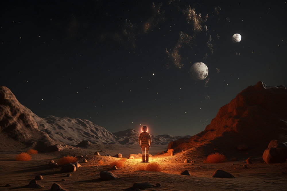 2 PunkteLicht und Farbe lagen an meinem Prompt, ich wollte auf eine "Cyberpunk"-Atmosphäre hinaus. Es geht aber auch ganz anders:2 Punkte- Science-Fiction aus Leonardo
