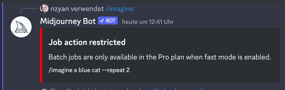 T3N meldet, dass Midjourney kostenlose Testaccounts stoppt, weil diese für Deepfakes missbraucht wurden. Berühmteste Beispiele sind Papst Franziskus im Balenciaga-Daunenmantel und Fake-Bilder von Donald Trumps Verhaftung – die nicht (noch nicht?) stattgefunden hat. Der Artikel bezieht sich auf diesen Artikel der Washington Post, in dem der Stop allerdings nicht erwähnt wird. In diesem Artikel auf „The Verge“ wird auch vom Stopp berichtet, dort begründet der Midjourney CEO David Holz den Stop mit großer Nachfrage und Missbrauch („extraordinary demand and trial abuse”) Ich habe das einfach mal ausprobiert: Es lässt sich durchaus noch ein neuer Account anlegen, allerdings erhält man beim Versuch, den Befehl /imagine zu benutzen, diese Fehlermeldung: -