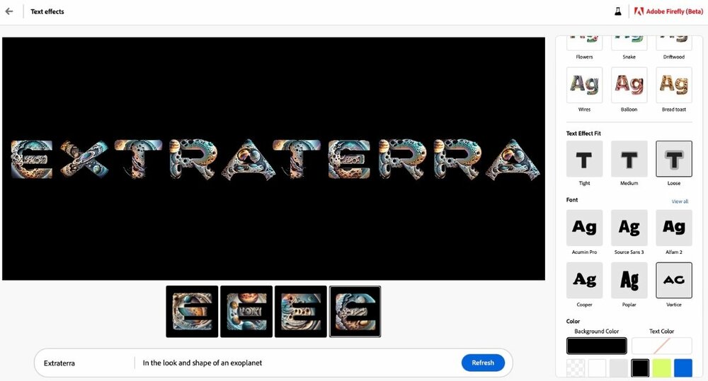 24. Der große Unterschied von Adobe Firefly zu z.B. Midjourney ist, dass man damit Text gestalten kann. Man kann in Firefly einen kurzen Text eingeben und mit einer Textur etc. versehen lassen, allerdings nicht mit einem Bild kombinieren - das müsste man derzeit noch händisch in Photoshop oder so erledigen. Die Vorgehensweise ist sehr einfach. Text eingeben, vorgefertigten Stil wählen oder per Prompt beschreiben, Font und Hintergrundfarbe wählen, et voila. Die grds. jeweilige Auswahl ist noch nicht wirklich groß, zeigt aber schon einmal gut die Richtung.