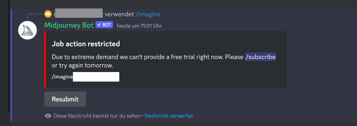 Es lässt sich durchaus noch ein neuer Account anlegen, allerdings erhält man beim Versuch, den Befehl /imagine zu benutzen, diese Fehlermeldung: