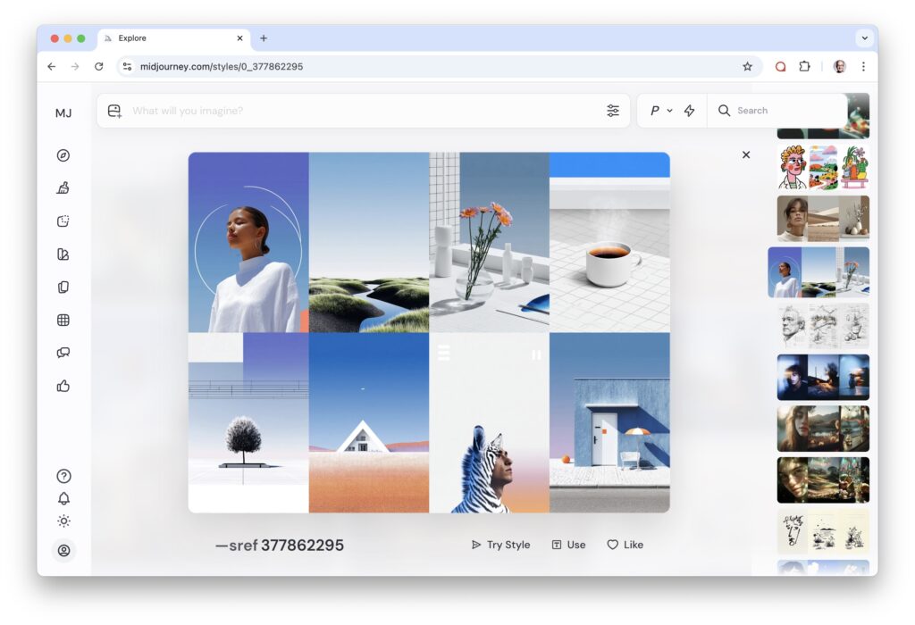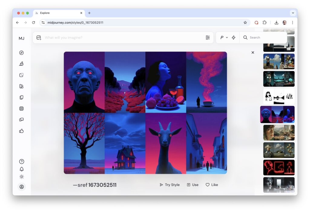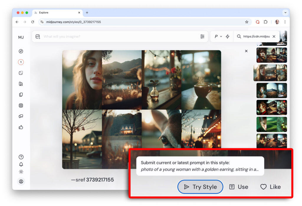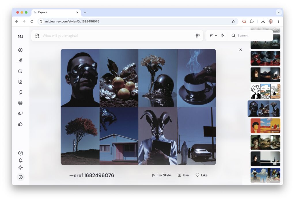 - Noch schneller geht es per „Try Style“: Mit einem Klick wird ein Bild mit diesem Style Code und dem zuletzt verwendeten Prompt generiert.