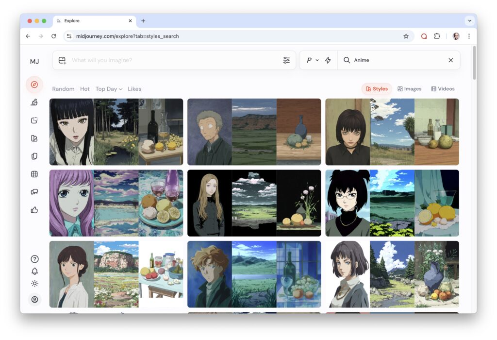 Neben den oben genannten Auswahl-Optionen kann auch deutlich zielgerichteter nach Codes für die eigene Bildidee suchen. Dafür könnt ihr im Suchfeld oben rechts auf der Stilseite eine „unscharfe Suche” starten. Wenn man beispielsweise „photographic” oder „Anime” eingibst, sucht der Algorithmus nach SREFs , die diesen Begriffen am besten entsprechen.
