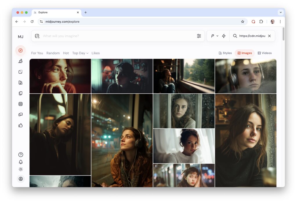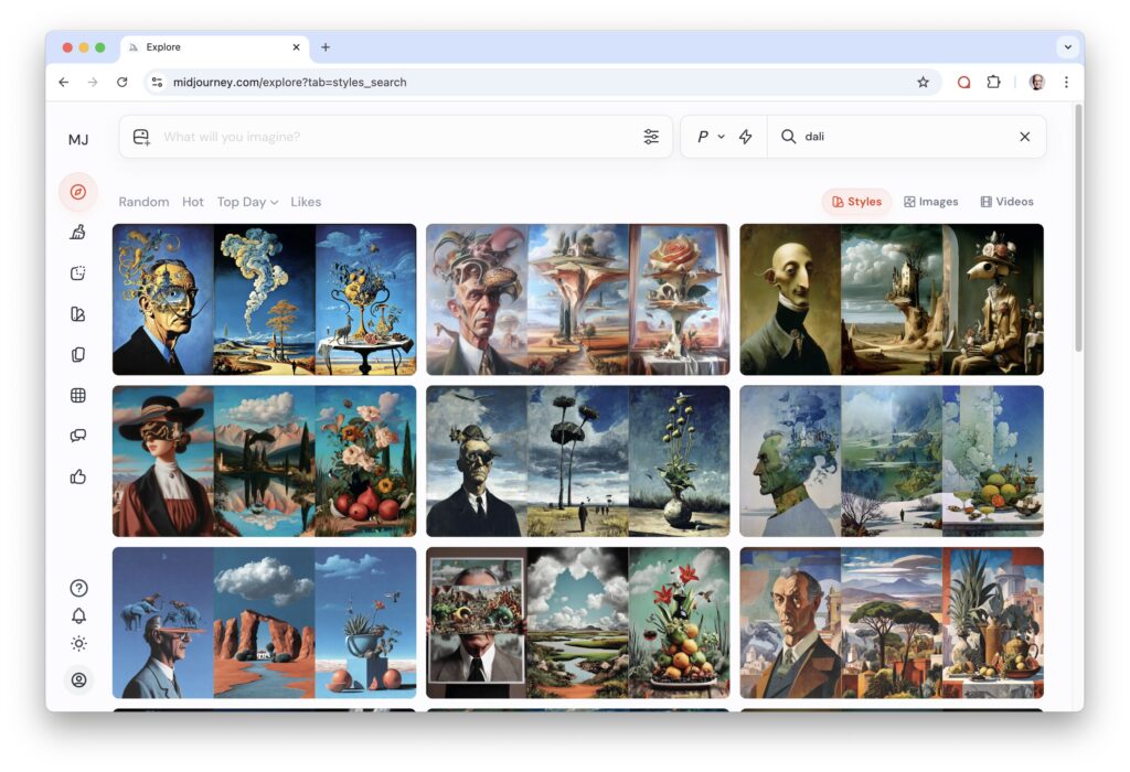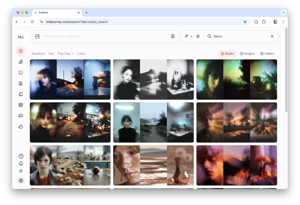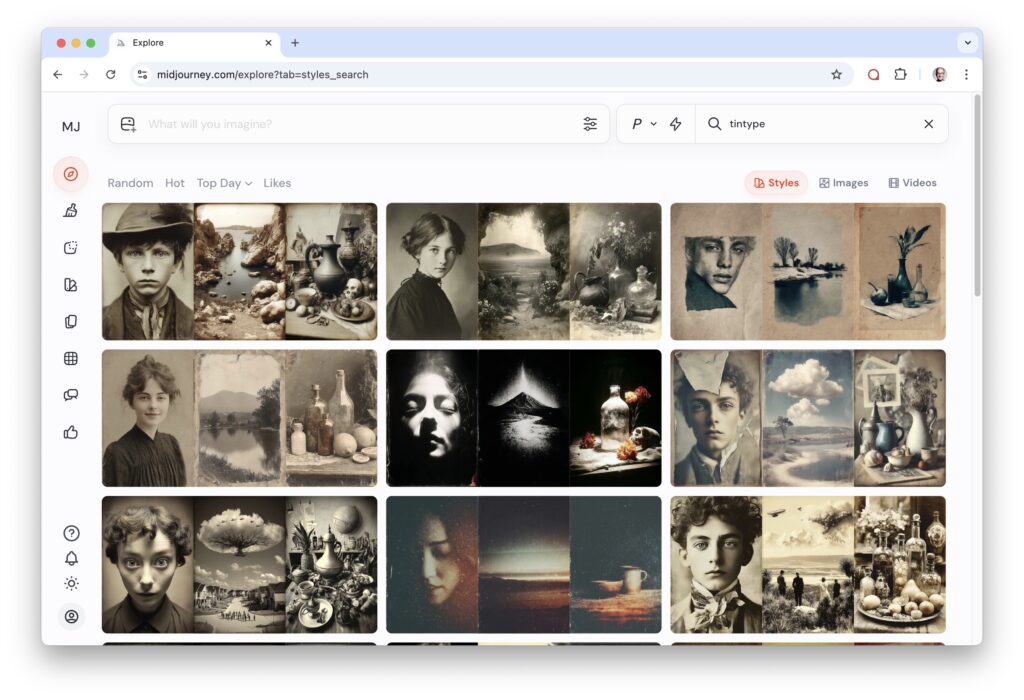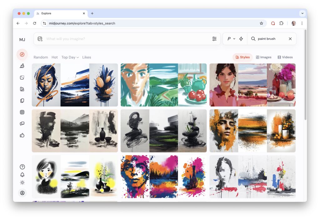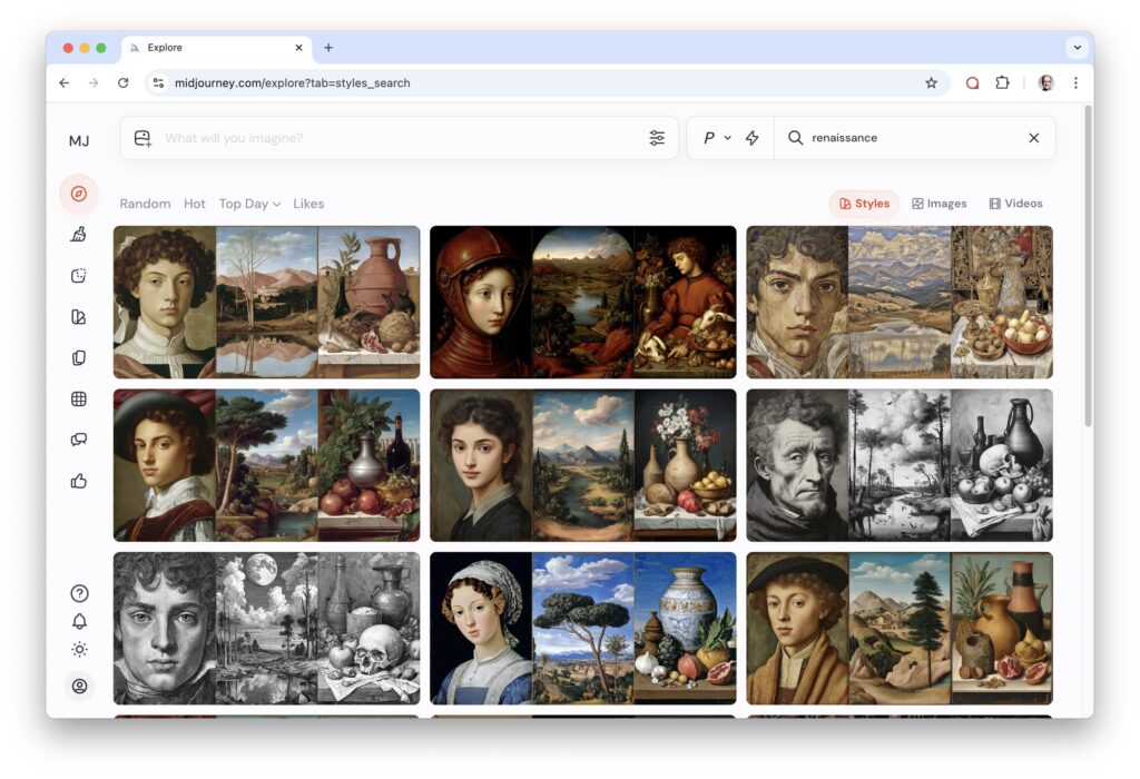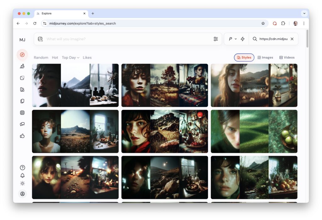 Auf der Midjourney Startseite wird für eingeloggten Kunden als Standard eine Auswahl beliebter Videos und Bilder angezeigt. Seit einigen Tagen findet man dort nun zusätzlich die Auswahl Styles: