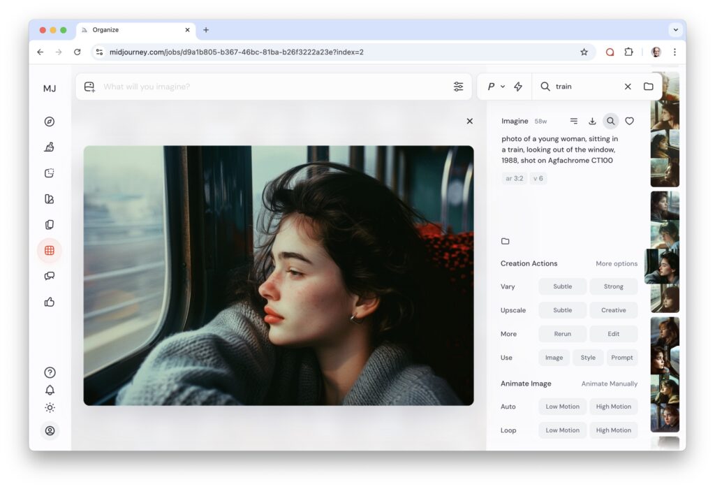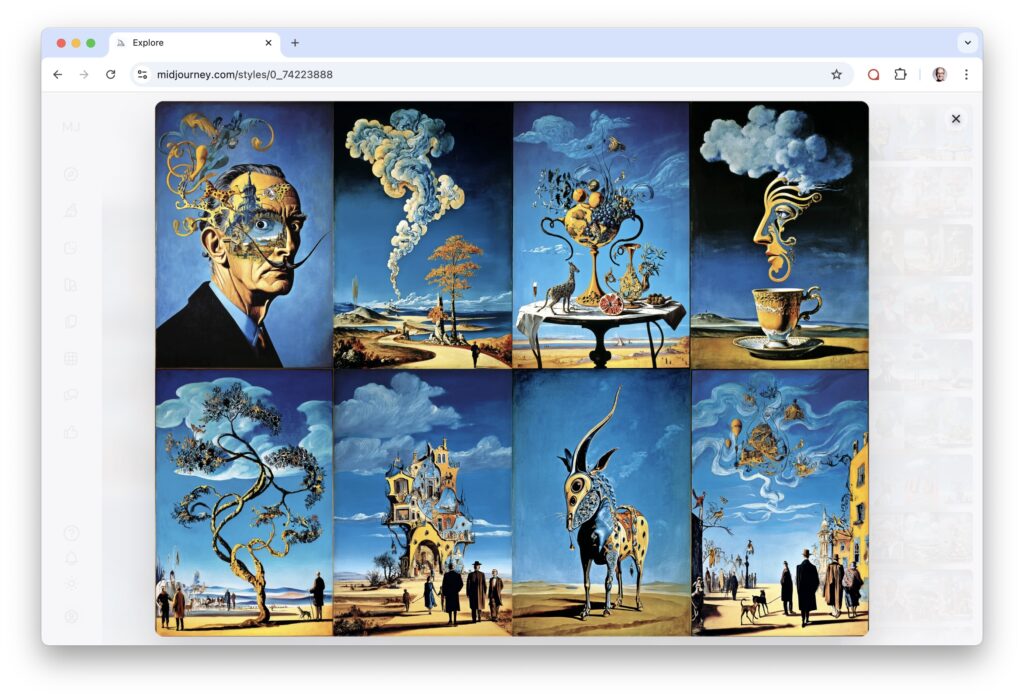 Wählt man diese Seite, so wird einem ein Set von Bildern, die mit identischen Prompts aber unterschiedlichen SREF Codes generiert wurden, angezeigt.