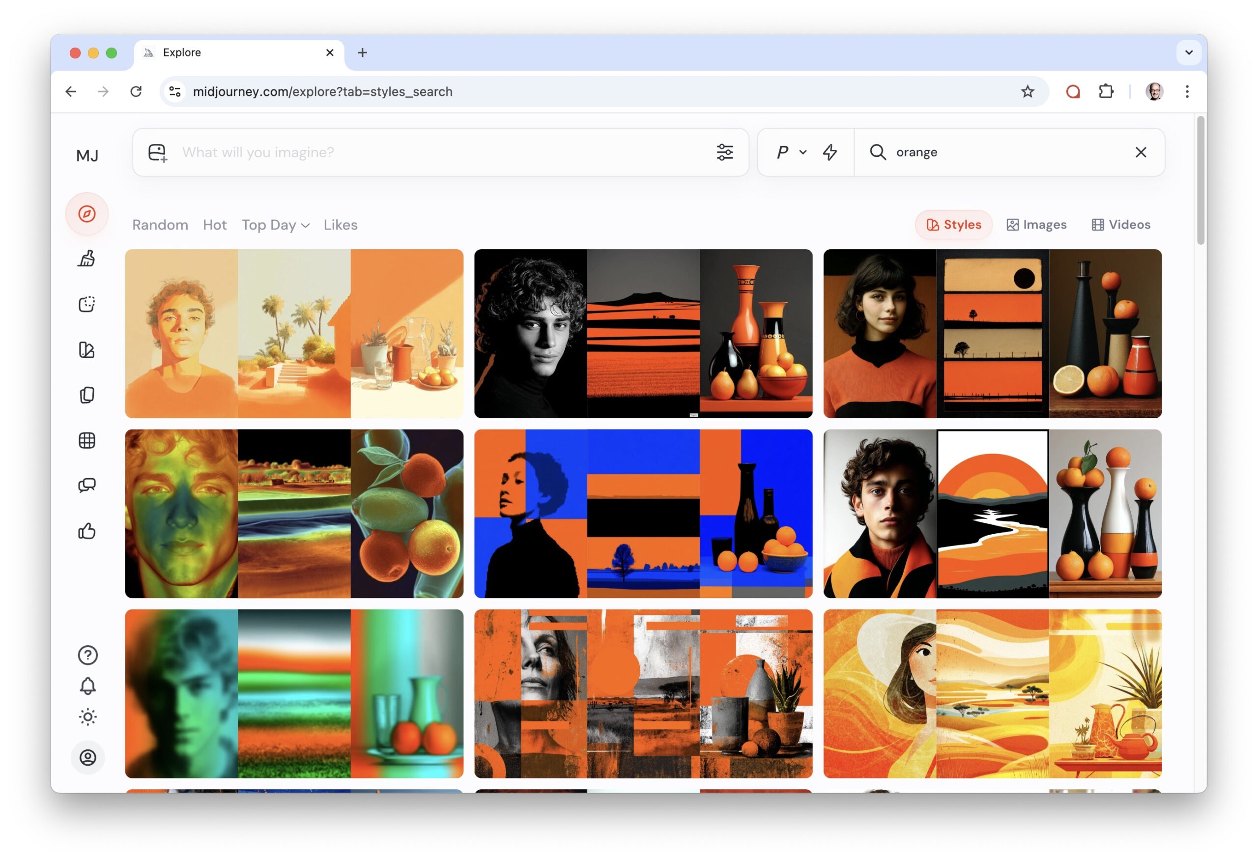 Auf der Midjourney Startseite wird für eingeloggten Kunden als Standard eine Auswahl beliebter Videos und Bilder angezeigt. Seit einigen Tagen findet man dort nun zusätzlich die Auswahl Styles: