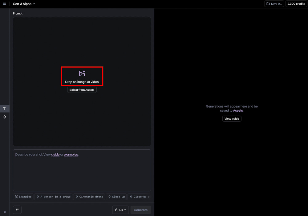 Ihr könnt die Gen-3 Alpha Engine, die für die Funktion notwendig ist, über die Startseite entweder direkt oben über den Gen-3 Hinweis Get started oder über das Menü in der linken Seitenleiste unter Generate Video erreichen.