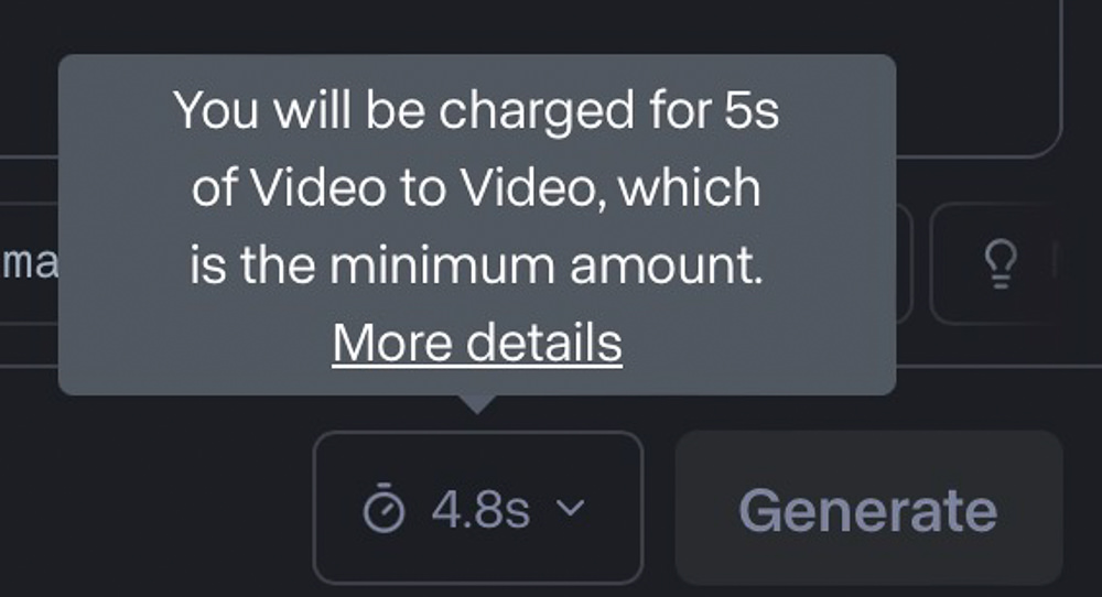 Achtung! Die Video-to-Video Funktion rechnet entweder 5s (50 Credits) oder 10s (100 Credits) ab. Sobald eine Videovorlage länger als 5 Sekunden ist, werden 10 Sekunden berechnet. Nutzt also entweder wirklich eine längere Vorlage oder kürzt Euer Video auf unter 5 Sekunden (ich nutze dazu am Mac den kostenlosen Quicktime Player).