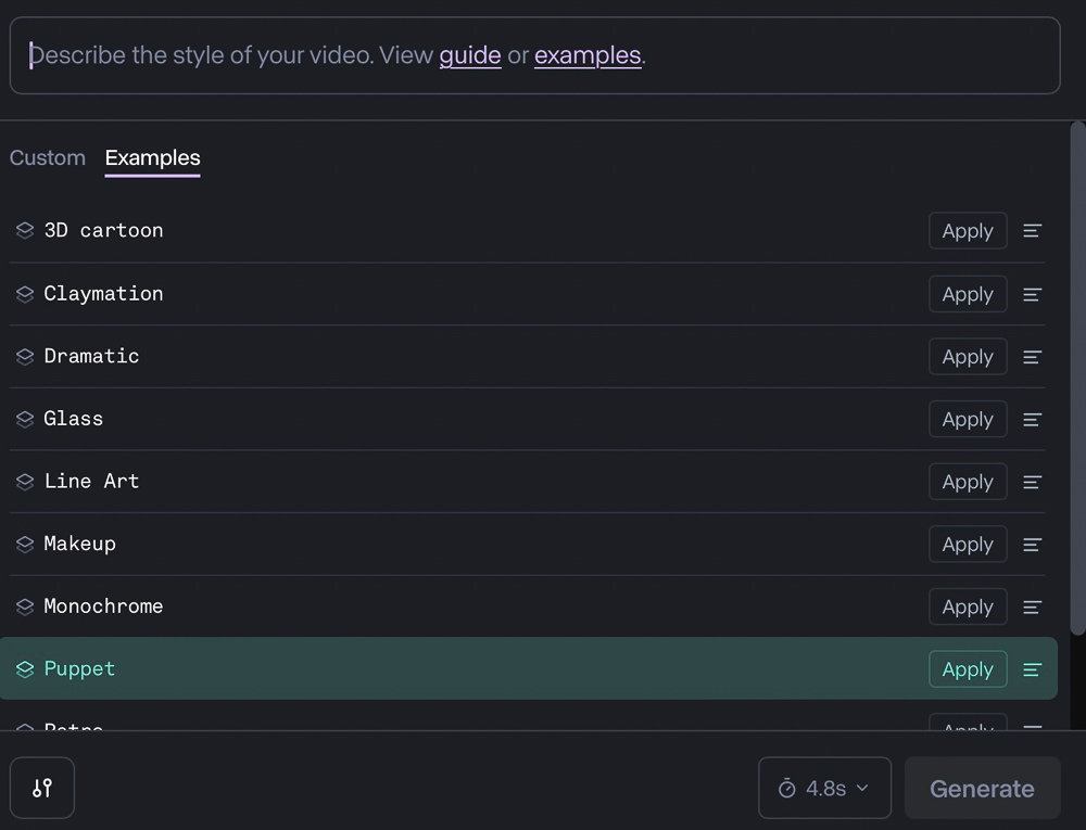 Als nächstes könnt Ihr in dem Prompt-Feld den gewünschten Stil eingeben. Alternativ wählt Ihr einen Stil aus den Beispielen (Examples) aus.