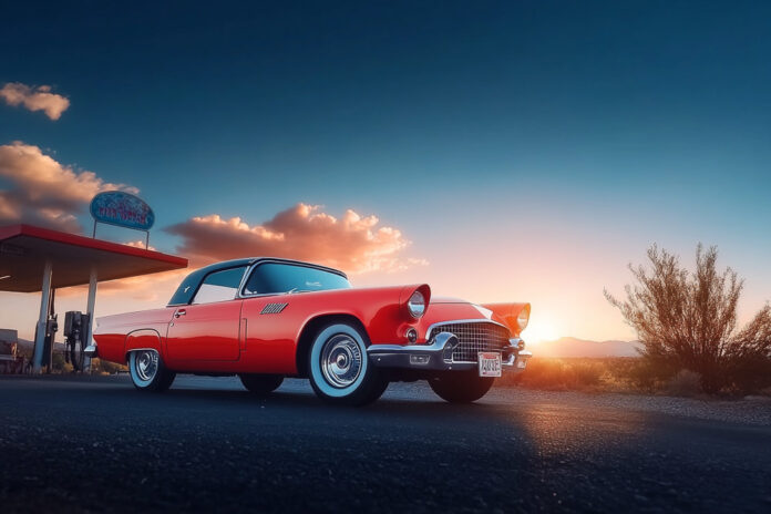 Ford Thunderbird in a limited color palette dominated by cool tones, particularly blues, to create a similar cold and tranquil atmosphere. Include subtle variations in the shades of blue to add depth and interest. Soft, ambient lighting with diffuse shadows. Mystery atmosphere. Icy ground, snowing.